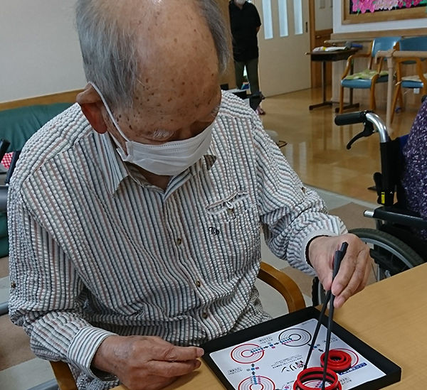 箸リンゲームのリングをひっくり返すのが面白いですね。右手の指にしびれがあるので、箸リンが指先の運動になって良いです。ここに来るときはいつもやっています。お箸でいつまでも食事をしたいですからね。これからも続けますよ。